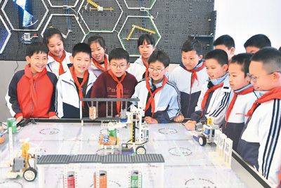 圖為江蘇省無錫市太湖格致中學(xué)以校園定點(diǎn)引導(dǎo)型機(jī)器人為主題,開展人工智能課堂教學(xué)。顧曉驊攝