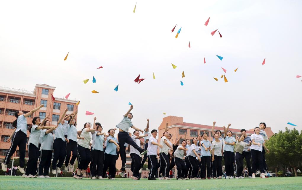 5月22日,在山東省高密市第五中學(xué),高三學(xué)生將寫有夢想的紙飛機拋向空中。高考臨近,各地學(xué)校組織高三學(xué)生開展不同形式的減壓活動,幫助學(xué)生放松心情,迎接高考。新華社發(fā)(李海濤攝)