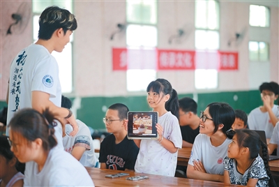 湖南省懷化市通道侗族自治縣萬佛山鎮(zhèn)木腳村,大學(xué)生在給孩子們上趣味AI實(shí)驗(yàn)課。李尚引攝(人民視覺)