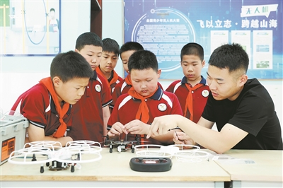 江蘇省宿遷市洋河新區(qū)實(shí)驗(yàn)小學(xué)師生進(jìn)行無人機(jī)組裝與拆卸維修。