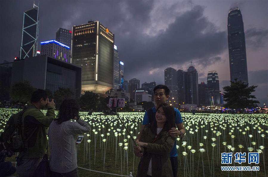 2月13日,市民在參觀玫瑰花燈。 當日,來自韓國首爾的LED Rose Garden大型公共展覽亮相香港。25000朵LED白玫瑰花燈在中環(huán)海濱展出,在情人節(jié)即將到來之際點亮維港,營造出浪漫甜蜜的氛圍。新華社記者 呂小煒 攝