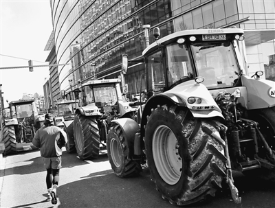 歐盟與俄羅斯之間的相互制裁導(dǎo)致歐盟成員國農(nóng)產(chǎn)品價(jià)格下跌,引發(fā)農(nóng)民不滿。圖為今年3月,比利時(shí)農(nóng)民將拖拉機(jī)開上布魯塞爾的街道,進(jìn)行抗議示威。人民視覺
