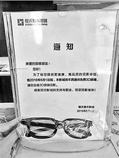 近日,北青報(bào)記者來到北京橙天嘉禾影城萬柳店。影院的工作人員證實(shí),影院不再免費(fèi)提供3D眼鏡是半年多前開始的,如果觀眾沒有攜帶3D眼鏡則需要在影院現(xiàn)場購買,否則就無法體驗(yàn)3D電影的效果。