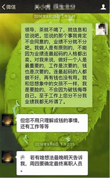 近日,民生銀行北京分行企業(yè)金融四中心副總經(jīng)理關(guān)某某被曝利用工作權(quán)利,以工作職位、業(yè)績(jī)?yōu)榛I碼對(duì)員工進(jìn)行要挾。據(jù)被曝光的微信聊天記錄顯示,關(guān)某某多次利用工作權(quán)利對(duì)下屬女員工言語騷擾,并脅迫外出開房,并稱“不同意就開除”。