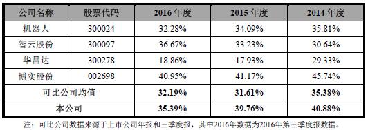 2014年至2016年,同行業(yè)上市公司綜合毛利率均值分別為35.38%、31.61%、32.19%??藖?lái)機(jī)電綜合毛利率高于可比公司均值。