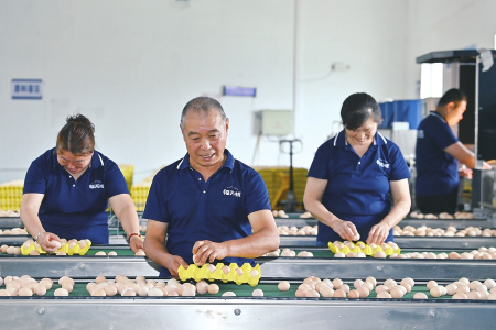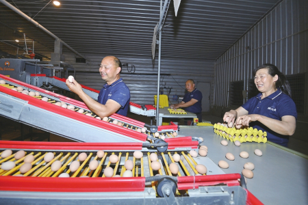 雞蛋通過自動分級機流向預先設定規(guī)格標準的生產(chǎn)線,工作人員再將大小一致的雞蛋收集碼盤。