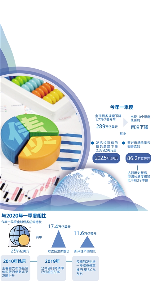 日前,國際金融協(xié)會發(fā)布了最新的全球債務監(jiān)測報告。好消息是全球債務規(guī)模在2021年一季度出現10個季度以來的首次下降;壞消息是全球債務規(guī)模體量巨大、償債能力不均衡等問題依然存在。