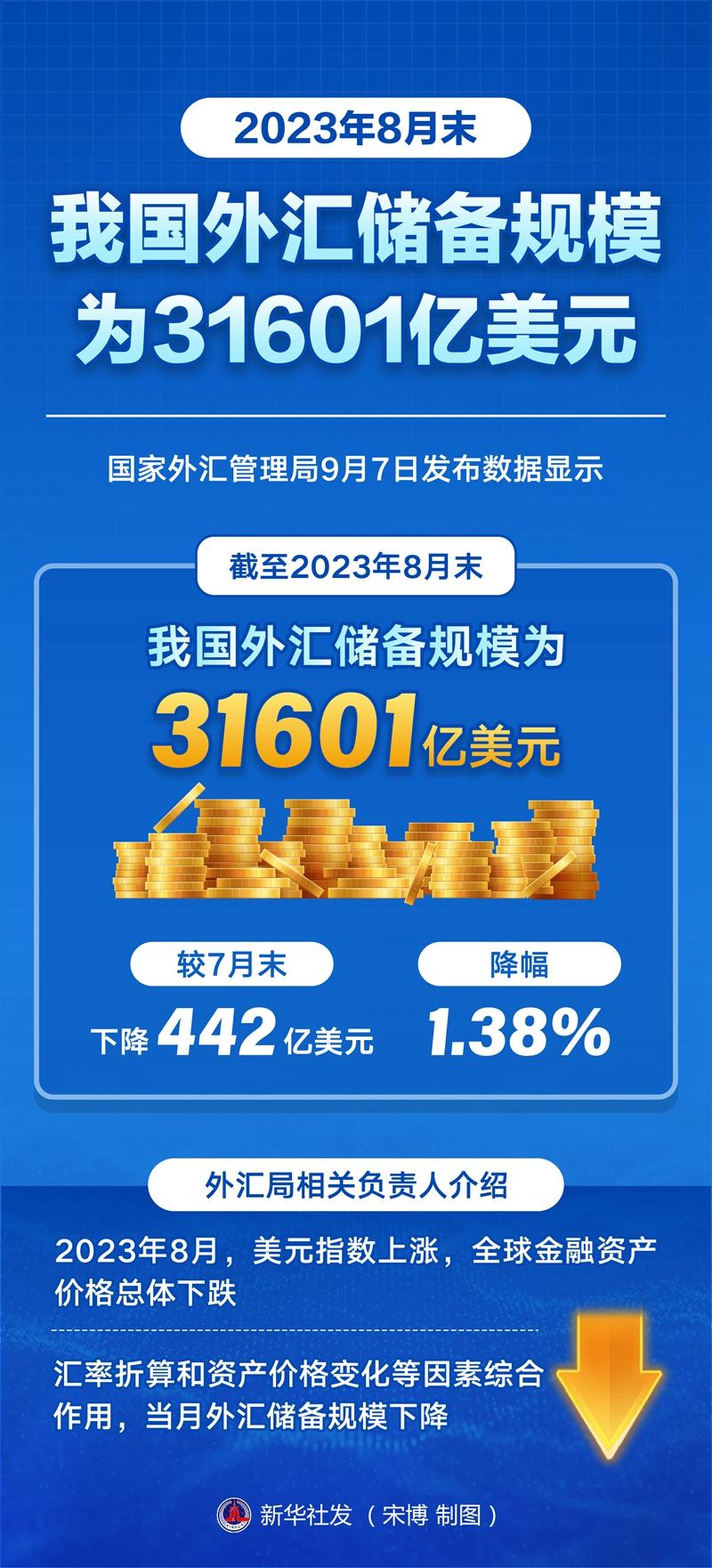 新華社北京9月7日電 國家外匯管理局7日發(fā)布數(shù)據(jù)顯示,截至2023年8月末,我國外匯儲備規(guī)模為31601億美元,較7月末下降442億美元,降幅為1.38%。
