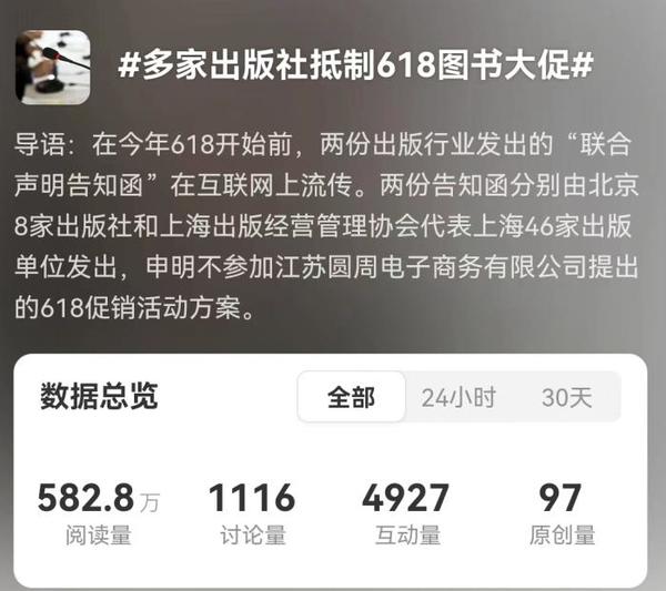 日前,兩份來(lái)自出版行業(yè)的“聯(lián)合聲明告知函”在網(wǎng)上流傳,引發(fā)大范圍討論,并最終成為一個(gè)焦點(diǎn)話題,“多家出版社抵制618圖書(shū)大促”。