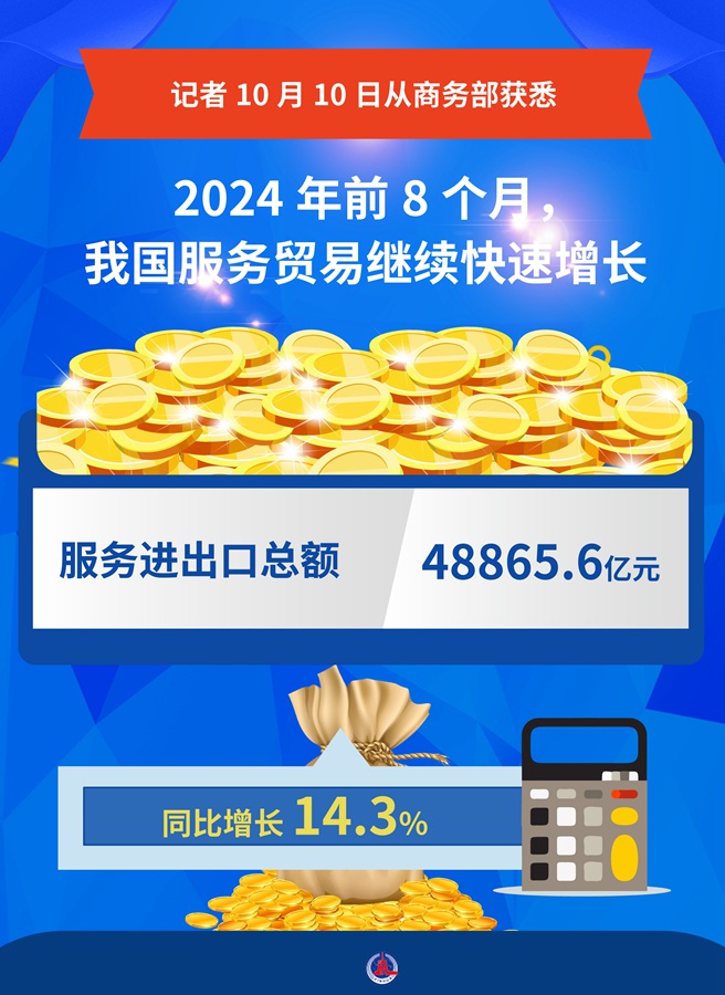 新華社北京10月10日電(記者謝?,帲┯浾?0日從商務(wù)部獲悉,今年前8個月,我國服務(wù)貿(mào)易繼續(xù)快速增長,服務(wù)進出口總額48865.6億元,同比增長14.3%。
