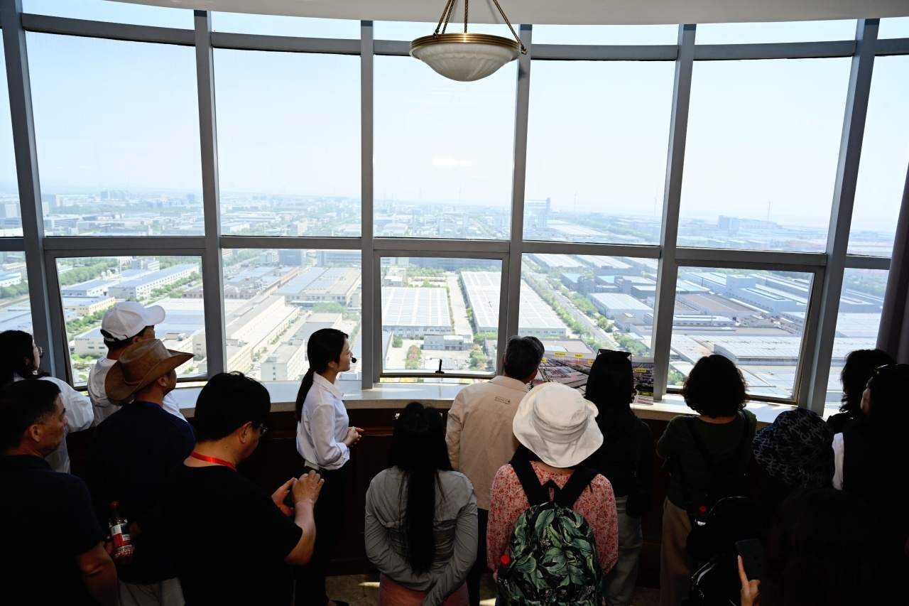 通過城市綠色觀景臺(tái),采訪團(tuán)成員們得以在空中觀景平臺(tái)俯瞰尖山全景,光伏發(fā)電板在陽光的照耀下熠熠生輝;不遠(yuǎn)處,風(fēng)力發(fā)電機(jī)的巨大葉片也在悠悠轉(zhuǎn)動(dòng)。這一光伏發(fā)電與風(fēng)力發(fā)電協(xié)同運(yùn)作的景象被毫無保留地盡收眼底。