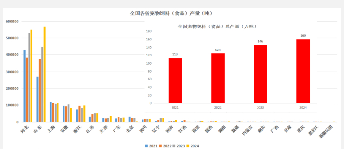 中國飼料工業(yè)協(xié)會(huì)數(shù)據(jù)顯示,2024年全國寵物飼料(主糧)產(chǎn)量達(dá)160萬噸,比五年前增長66.7%,連續(xù)多年保持兩位數(shù)增長。2025年前7個(gè)月,產(chǎn)量達(dá)100.6萬噸,同比增長14.5%。