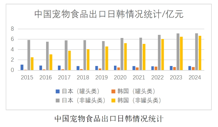王金全分析認(rèn)為,日韓是我國寵物食品重要出口地,2022年占出口總額12%,中國品牌憑性價(jià)比與差異化切入日本市場,2024年對(duì)韓非罐裝類出口額較2015年翻倍。