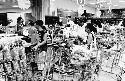 由于巴西通貨膨脹攀升導(dǎo)致消費(fèi)不振,民眾購物更趨謹(jǐn)慎。圖為在里約熱內(nèi)盧一家超市,當(dāng)?shù)孛癖娫诓少徤畋匦杵贰S浾?顏 歡攝