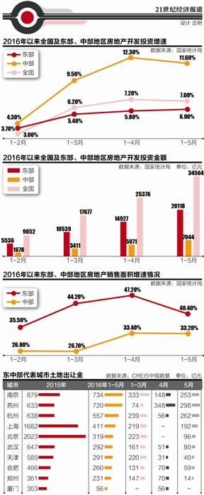 不過(guò),整個(gè)4月,作為一線城市的北京和上海竟無(wú)一幅地塊出讓?zhuān)搅?月,北京、上海、蘇州、南京、杭州開(kāi)始集中供地,僅這5個(gè)城市當(dāng)月的土地出讓金就高達(dá)1101億元。作為中部城市的合肥、武漢、鄭州等地卻放慢了供地節(jié)奏,這成為導(dǎo)致中部地區(qū)房地產(chǎn)開(kāi)發(fā)投資增速在5月首次調(diào)頭向下的主因。