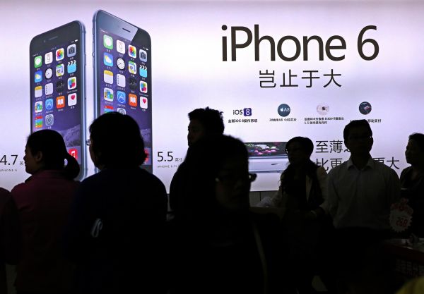2014年10月17日,顧客在江西南昌的一家蘋果授權(quán)經(jīng)銷店門口排隊,等待購買iPhone6和iPhone6 Plus手機。 (新華社發(fā))