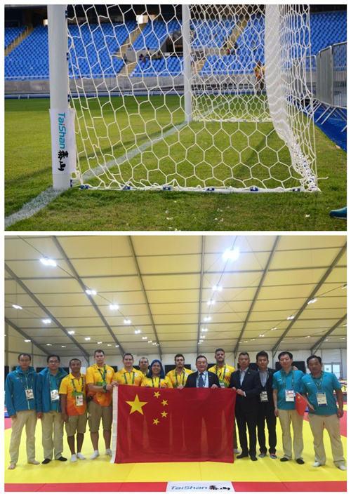 (圖為里約奧運會上泰山體育提供的足球比賽設(shè)施和摔跤墊,泰山體育提供)