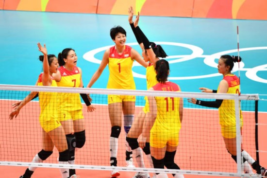 (圖為里約奧運會女排小組賽中,中國隊球員在與波多黎各隊比賽中慶祝得分。新華社圖片)