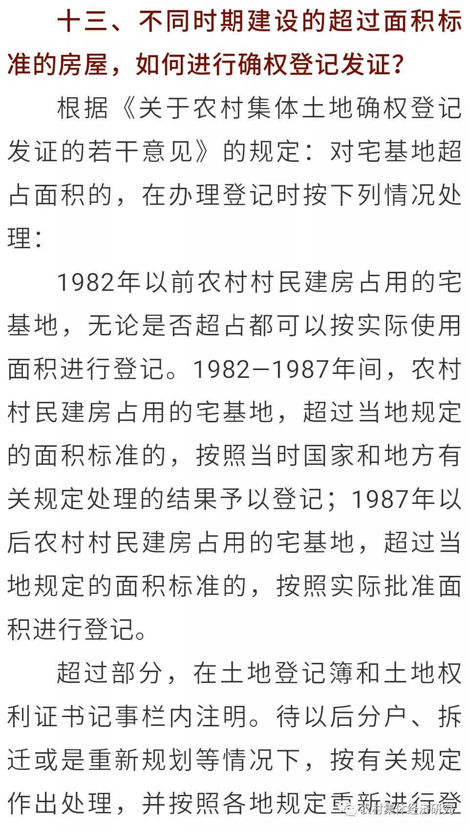 十七、非本村村民依法取得的宅基地可以登記嗎?以下情況可以進(jìn)行確權(quán)登記:“非本村集體成員因扶貧搬遷、地質(zhì)災(zāi)害防治、新農(nóng)村建設(shè)、移民安置等按照政府統(tǒng)一規(guī)劃和批準(zhǔn)使用宅基地的,在退出原宅基地并注銷登記后,應(yīng)依法確定新建房屋占用的宅基地使用權(quán)?!?982年前,非農(nóng)業(yè)戶口居民(含華僑)合法取得的宅基地或因合法取得房屋而占用的宅基地,范圍自1982年至今未擴(kuò)大的,可按實(shí)際使用面積予以確權(quán)登記;1982—1999年止,非農(nóng)業(yè)戶口居民(含華僑)合法取得的宅基地或因合法取得房屋而占用的宅基地,按照批準(zhǔn)面積予以確權(quán)登記,超過批準(zhǔn)的面積在登記簿和權(quán)屬證書附記欄中注明。