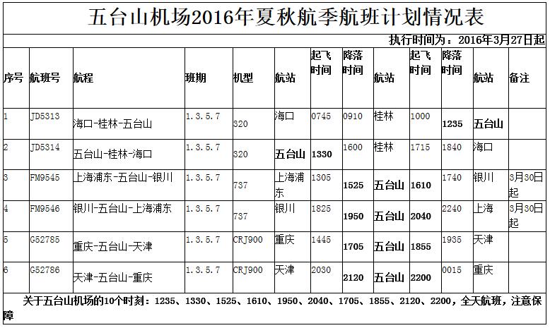 二、2016年3月27日忻州市五臺山機(jī)場執(zhí)行民航夏秋季航班時刻,每周一、三、五、日、每日五班的航班時刻,車輛運(yùn)營線路和運(yùn)營時間如下。