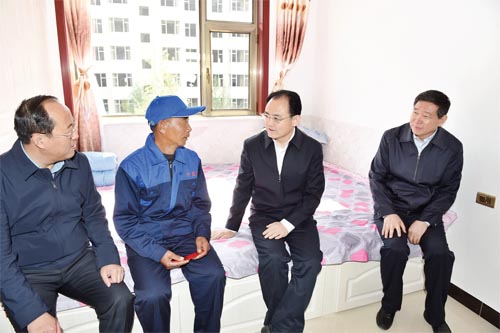 圖為市委書記李俊明在岢嵐縣城扶貧移民集中安置點(diǎn)回訪貧困戶曹六仁。馮曉磊 攝
