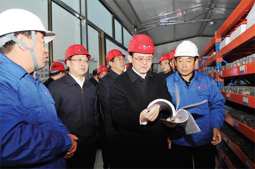 圖為市委書記李俊明在山西天寶集團有限公司調(diào)研質(zhì)量可追溯系統(tǒng)建設(shè)情況。(本報記者 劉紀森 攝)