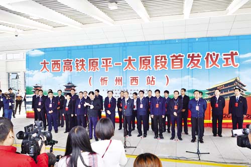 圖為大西高鐵原平至太原段首發(fā)儀式在忻州西站舉行,省人大常委會副主任、市委書記李俊明宣布高鐵開通并發(fā)出發(fā)車指令。本報記者 宮愛文 攝