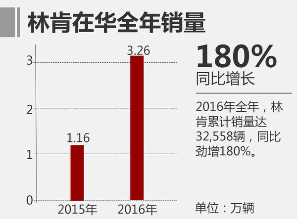 在陸續(xù)引入四款新車后,隨著產(chǎn)品線的逐漸豐富,開始走“親民”路線的林肯在重回中國市場后銷量大幅攀升。較之2015年的11,630輛,2016年全年林肯累計銷量達32,558輛,同比勁增180%,其增速成為中國成長最快的豪華品牌。在第四季度,林肯單月銷量達11,562輛,占全年銷量的35.5%,同比增幅162%。