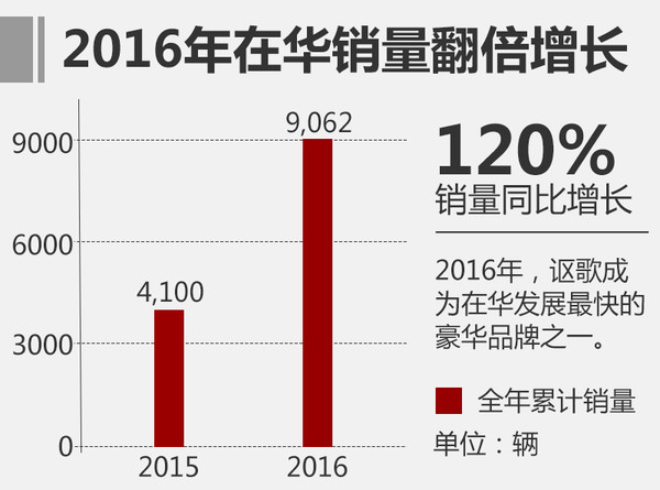 由于此前在華的產(chǎn)品投入等多方問題,入華已經(jīng)達到10年的本田高端品牌謳歌,銷量并沒有得到顯著提升,2015年謳歌在中國市場的新車上牌量僅為4,100輛,數(shù)據(jù)并不美麗。2016年謳歌重整旗鼓,制定完善的在華戰(zhàn)略,推出首款國產(chǎn)車型CDX后其銷量得到明顯提升,2016年累計售出9,062輛,同比大增120%,成為增速第二快的豪華品牌。