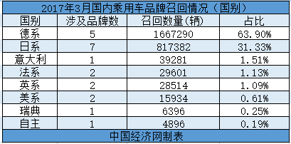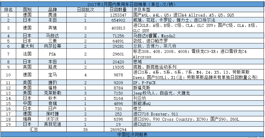 根據(jù)國家質(zhì)檢總局缺陷產(chǎn)品管理中心3月份發(fā)布的召回公告,中國經(jīng)濟(jì)網(wǎng)汽車頻道經(jīng)過匯總、統(tǒng)計(jì),整理出“3月國內(nèi)乘用車召回榜單”。3月份,中國汽車市場內(nèi)共有21個(gè)汽車品牌發(fā)布了累計(jì)36次召回公告,共計(jì)召回2609294輛汽車。
