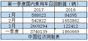 2016年,國內(nèi)乘用車召回?cái)?shù)量首次突破一千萬輛,達(dá)到11331565輛。進(jìn)入2017年,國內(nèi)乘用車召回?cái)?shù)量繼續(xù)井噴,今年一季度累計(jì)召回汽車3740139輛,同比2016年一季度的1860669輛增長了101.01%。