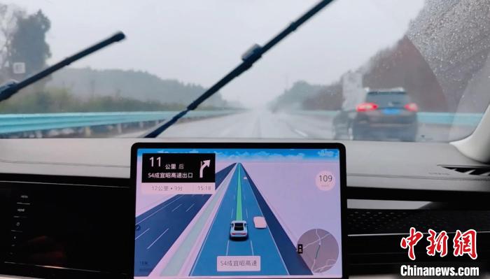 圖為國內(nèi)首個“智慧高速+車機(jī)導(dǎo)航”應(yīng)用在下雨的成宜高速上使用。 蜀道集團(tuán)供圖