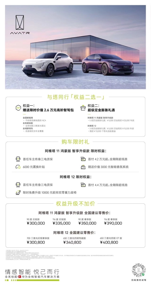 權(quán)益一,1月8日后購(gòu)車的用戶贈(zèng)送限時(shí)價(jià)值26,000元高階智駕包,以不依賴高精地圖的NCA帶來(lái)全域都領(lǐng)先的高速城區(qū)泊車全覆蓋體驗(yàn)。權(quán)益二,活動(dòng)期間購(gòu)車用戶可享5倍定金膨脹禮遇,5000定金抵扣25,000元車款,車價(jià)立減兩萬(wàn)元。與此同時(shí),阿維塔推出更多貼心限時(shí)權(quán)益:首任車主終身三電質(zhì)保,6000元置換補(bǔ)貼即刻擁有;另外,全系車主可享智能香氛系統(tǒng)贈(zèng)送,并擁有首付4.2萬(wàn)元起、全期限超低息的購(gòu)車金融權(quán)益。與此同時(shí),阿維塔 11 鴻蒙版智享升級(jí)款全國(guó)零售價(jià)30萬(wàn)- 39萬(wàn)元,真正做到產(chǎn)品升級(jí)不加價(jià)。