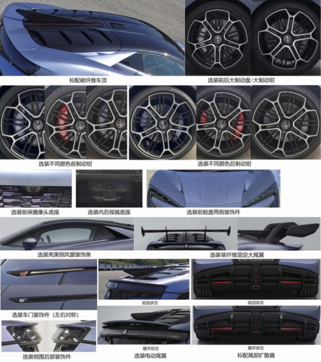 仰望U9在保留超跑經(jīng)典設(shè)計(jì)元素同時(shí)整體視覺(jué)感受未來(lái)科技感十足。前臉兩側(cè)造型銳利的C字形燈組點(diǎn)亮后極具辨識(shí)度,向前俯沖的車頭姿態(tài)結(jié)合前唇部位夸張的空氣動(dòng)力學(xué)組件則使其更具戰(zhàn)斗氣息。新車側(cè)面造型較為凌厲,略微向外凸出的輪拱搭配大尺寸五輻式輪圈和高性能剎車系統(tǒng)運(yùn)動(dòng)感十足。與此同時(shí),仰望U9還在車側(cè)加入導(dǎo)風(fēng)口設(shè)計(jì)并配備專屬側(cè)裙組件,進(jìn)一步增強(qiáng)車輛空氣動(dòng)力學(xué)及動(dòng)態(tài)操控表現(xiàn)。值得一提的是,該車還采用了“蝴蝶門”設(shè)計(jì)。