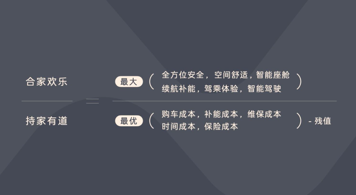另一點(diǎn)專注放在用戶的核心需求上,這需要產(chǎn)品呈現(xiàn)——話筒交給了他,他用了一個家庭用車價值公式,將產(chǎn)品作為一個分?jǐn)?shù),其中分子體驗(yàn)價值的最大化,分母是擁車成本的最優(yōu)化。