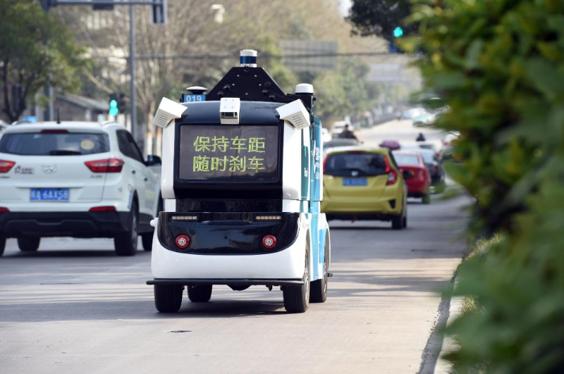 資料圖片:2022年3月15日,一輛無(wú)人配送車在合肥高新區(qū)進(jìn)行公開(kāi)道路測(cè)試。新華社記者 周牧 攝