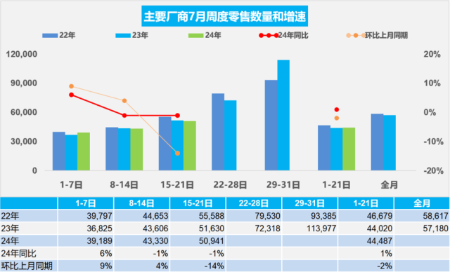 【環(huán)球網(wǎng)科技綜合報道】7月25日消息,乘聯(lián)分會日前發(fā)布了最新的乘用車市場零售數(shù)據(jù)。數(shù)據(jù)顯示,7月1日至21日,乘用車市場零售量為93.4萬輛,同比去年同期微增1%,但較上月同期下降了2%。今年以來,乘用車市場累計零售量已達1077.4萬輛,同比增長3%。