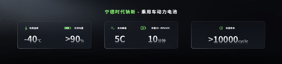 鈉新乘用車動力電池的能量密度達175Wh/kg,為當前全球鈉電最高,比肩磷酸鐵鋰電池;支持峰值5C的充電速率和500公里續(xù)航,實現超1萬個循環(huán)的壽命,同時大幅降低維護成本。在安全性上,鈉新電池從材料本征層面消除電池熱失控中的助燃因素,實現電池安全從"被動防御"到"本質安全"的跨越式突破。