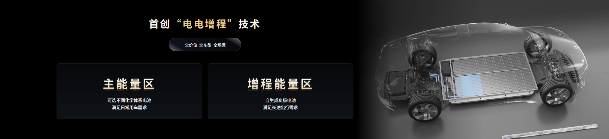 驍遙雙核電池首創(chuàng)的“電電增程”技術,能夠結合車輛的行駛狀態(tài)和用戶駕駛習慣,智能調控兩個能量區(qū)的分配策略。主能量區(qū)可以根據用戶的駕駛習慣與場景,適配不同化學體系的電芯,滿足日常用車需求;增程能量區(qū)可采用高比能自生成負極技術,提供更大的電量,以滿足用戶的長途出行需求。