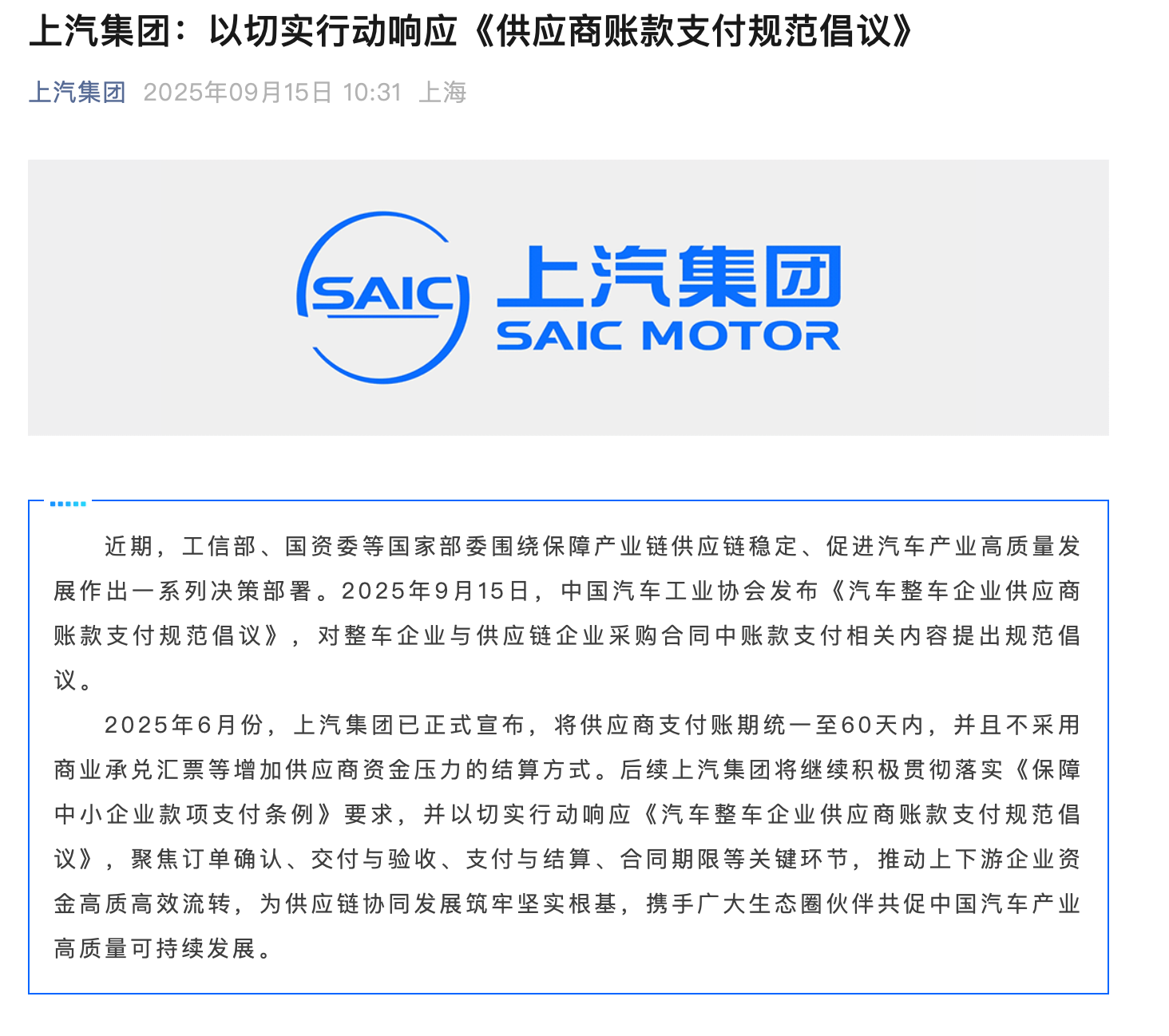 央廣網(wǎng)北京9月15日消息(記者董楠)9月15日,中國汽車工業(yè)協(xié)會(簡稱“中汽協(xié)”)發(fā)布《汽車整車企業(yè)供應商賬款支付規(guī)范倡議》,提出為了推動汽車行業(yè)落實《保障中小企業(yè)款項支付條例》,支持重點車企高質量踐行供應商賬期承諾,在充分協(xié)商的基礎上,對整車企業(yè)與供應商企業(yè)采購合同中賬款支付相關內容作出規(guī)范倡議,規(guī)范涉及訂單確認、交付與驗收、支付與結算、合同期限多個環(huán)節(jié)。