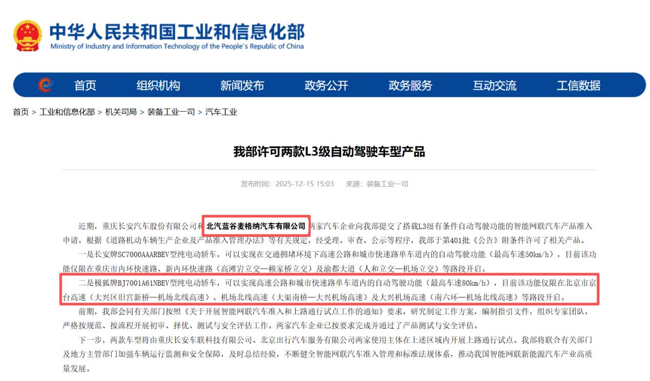 12月15日,北汽集團旗下極狐阿爾法S(L3版)正式獲批工業(yè)和信息化部自動駕駛車型產(chǎn)品準入許可,即將在北京市限定區(qū)域內(nèi)開展L3級有條件自動駕駛上路通行試點。這標志著我國自動駕駛技術(shù)發(fā)展逐步走向量產(chǎn)應用階段,也是北汽集團在自動駕駛領域從技術(shù)驗證階段邁向量產(chǎn)應用階段的重要里程碑。