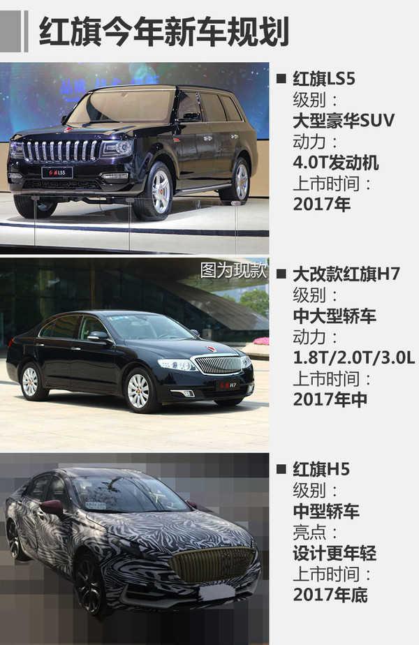 作為國內(nèi)自主車企中較早涉獵“豪華汽車”領域的品牌,紅旗已擁有針對公務行政和私人消費市場的LS5和H7兩款產(chǎn)品,未來其還將進一步擴充產(chǎn)品陣容。中國一汽紅旗分公司總經(jīng)理韓新亮表示,“十三五”期間,紅旗將迎來產(chǎn)品線的爆發(fā)。另據(jù)網(wǎng)通社獲得的消息,紅旗將在今年到2020年間陸續(xù)推出8款新車型,其中全新豪華大型SUV——LS5等3款新車將于年內(nèi)上市銷售。