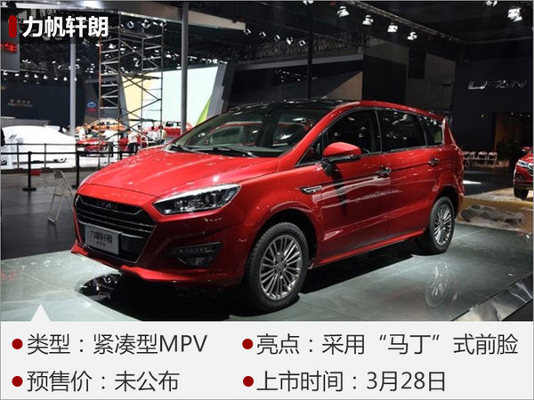 在2016年11月舉行的廣州國際車展上,力帆汽車對外發(fā)布了全新MPV—軒朗,其“馬丁”式前臉設(shè)計令人印象深刻,同時運動化輪圈與下沉式車頂?shù)拇钆湟彩窍嗟靡嬲?。?nèi)飾方面,力帆軒朗以黑色為主,中控臺下方按鍵布局較為簡潔,實用性較高。力帆軒朗搭載了1.5L渦輪增壓和2.0L自然吸氣兩款發(fā)動機(jī),前者匹配的是8速自動變速箱或5速手動變速箱,后者則匹配的是5MT或CVT變速箱。新車將于3月28日正式上市。