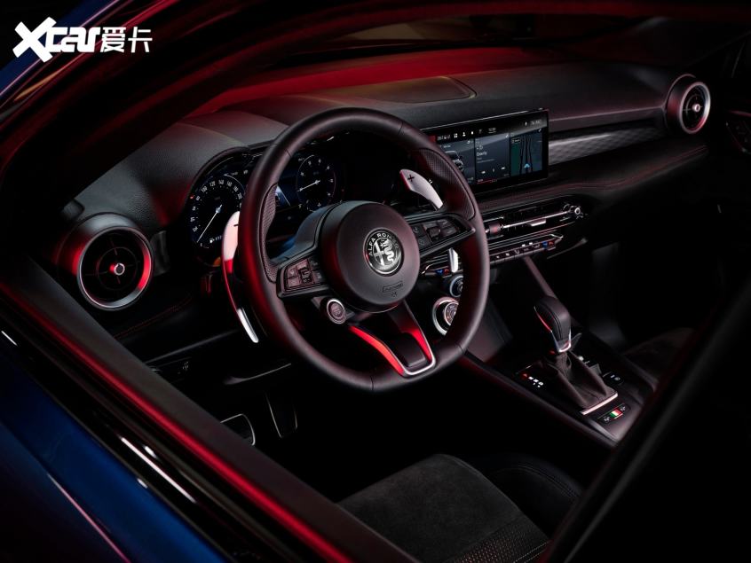 內飾同樣延續(xù)了阿爾法·羅密歐家族的經典設計,啟動按鈕設計在方向盤上,懸浮式中控屏尺寸為10.25英寸,并支持無線CarPlay和百度CarLife功能。
