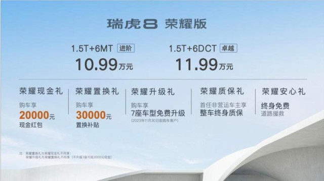 此外,瑞虎8榮耀版還為購車用戶帶來了5重購車禮遇,包括榮耀現(xiàn)金禮:購車即享20000元現(xiàn)金紅包、榮耀置換禮:購車即享30000元置換補貼(本品/他品同享)、榮耀升級禮:購車可享7座車型免費升級(2023年11月30日前購車客戶)、榮耀質(zhì)保禮:首任非營運車主享整車終身質(zhì)保、榮耀安心禮:終身免費道路救援。(注:榮耀置換禮與榮耀現(xiàn)金禮不同享;榮耀升級禮與榮耀置換禮不同享;不升級7座可抵3000元現(xiàn)金。)