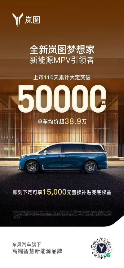 展望未來,嵐圖汽車CEO盧放表示:“2025年將推出4款以上全新或改款車,以更加完善的SUV、轎車和MPV產(chǎn)品布局,進一步滿足廣大用戶的個性化需求。全新嵐圖夢想家將以領(lǐng)先一代的產(chǎn)品力,成為絕對爆款,夯實‘頂流’地位,同時嵐圖繼續(xù)打造更多爆款,全力沖刺全年20萬輛的銷量目標(biāo),為更多用戶提供持續(xù)、穩(wěn)定、靠譜的產(chǎn)品和服務(wù)?!?/p>
