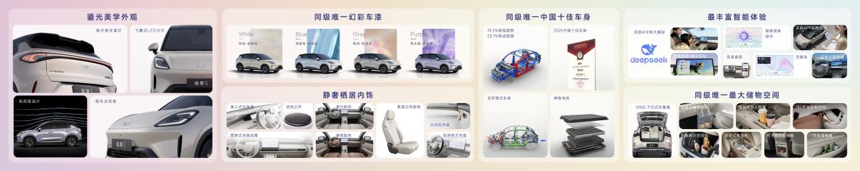 步入“舒嶼座艙”,細節(jié)皆巧思。繽果S以“靜奢棲居美學”為靈感,通過環(huán)抱式布局、貫穿式內(nèi)嵌風幕與柔感貝殼座椅等設計,營造出沉浸式的舒適氛圍。搭配同級唯一的6揚聲器系統(tǒng)與阿嘉米斯專業(yè)聲場調(diào)校,進一步提升了座艙的靜謐質(zhì)感與聽覺享受。12.8英寸高清大屏內(nèi)置“1+N”靈語AI中樞大模型,深度融合DeepSeek大模型,以更全面的壁紙玩法、八大區(qū)域的方言溝通、更多的智能場景應用,為用戶帶來真正“更懂你的”智能座艙體驗。