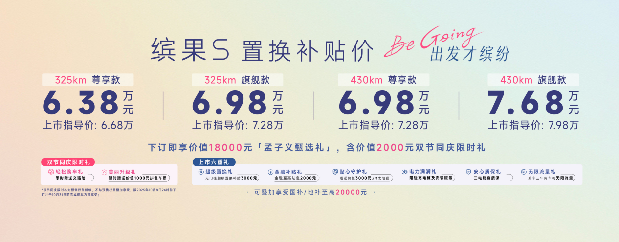 繽果S共推出325km尊享款、325km旗艦款、430km尊享款、430km旗艦款四款配置,上市指導價為6.68萬-7.98萬元,疊加置換政策可享置換補貼價6.38萬-7.68萬元,更可疊加享受至高20,000元的國家/地方購車補貼。