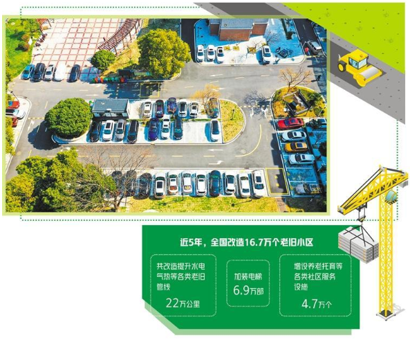 近年來,老舊小區(qū)改造取得積極進(jìn)展。住房和城鄉(xiāng)建設(shè)部最新統(tǒng)計數(shù)據(jù)顯示,近年來,各地在老舊小區(qū)改造中,共改造提升水電氣熱等各類老舊管線22萬公里,加裝電梯6.9萬部,增設(shè)停車位240萬個、電動汽車充電樁6.8萬個,增設(shè)養(yǎng)老托育等各類社區(qū)服務(wù)設(shè)施4.7萬個。