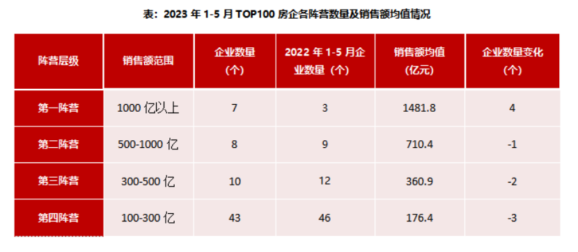 同時,1-5月,千億以上陣營企業(yè)數(shù)量增加。具體來看,千億以上陣營7家,較去年同期增加4家,銷售額均值1481.8億元。第二陣營(500-1000億元)企業(yè)8家,較去年同期減少1家,銷售額均值710.4億元。第三陣營(300-500億元)企業(yè)10家,較去年同期減少2家,銷售額均值360.9億元。第四陣營(100-300億元)企業(yè)為43家,較去年同期減少3家,銷售額均值176.4億元。